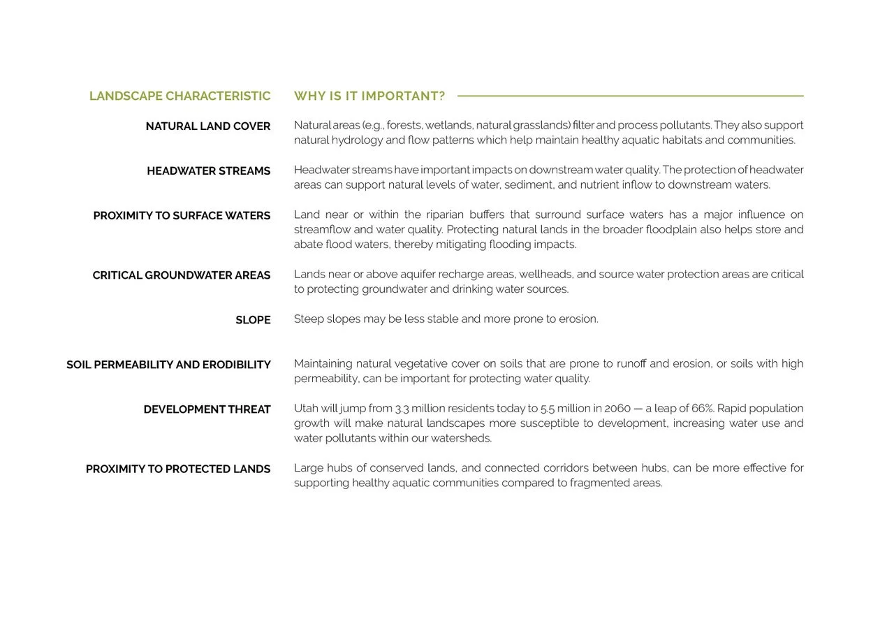 The conservation of natural lands supports watershed protection by maintaining important elements of the water cycle such as groundwater recharge, and by minimizing the accumulation and runoff of pollutants. Conserving well-managed agricultural lands prevent conversion to alternative land uses such as development, that pose greater threats to water quality and quantity. Placing conservation easements on natural lands permanently protects our watersheds from destruction, growth and high water consumption and use, ultimately directing water back into the Great Salt Lake.